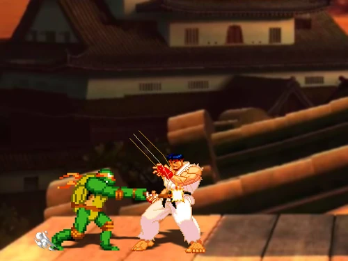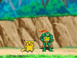 Sonic and Michelangelo are fighting Rocksteady and Bebop.