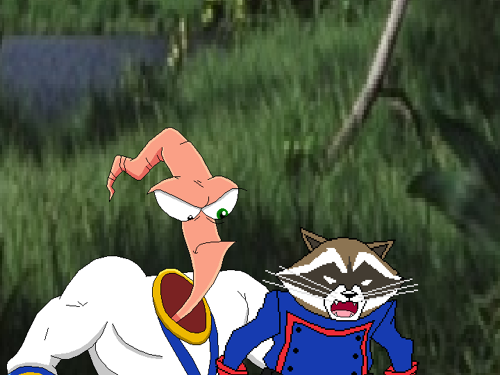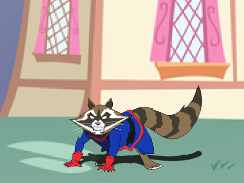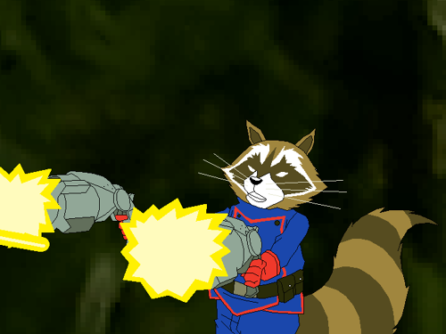 In honor of the release of the Guardians of the Galaxy movie, here's a special illustration of Rocket Raccoon with Ruby, Charlie the Tuna and Sonic the Hedgehog in a Guardians of the Galaxy uniform.